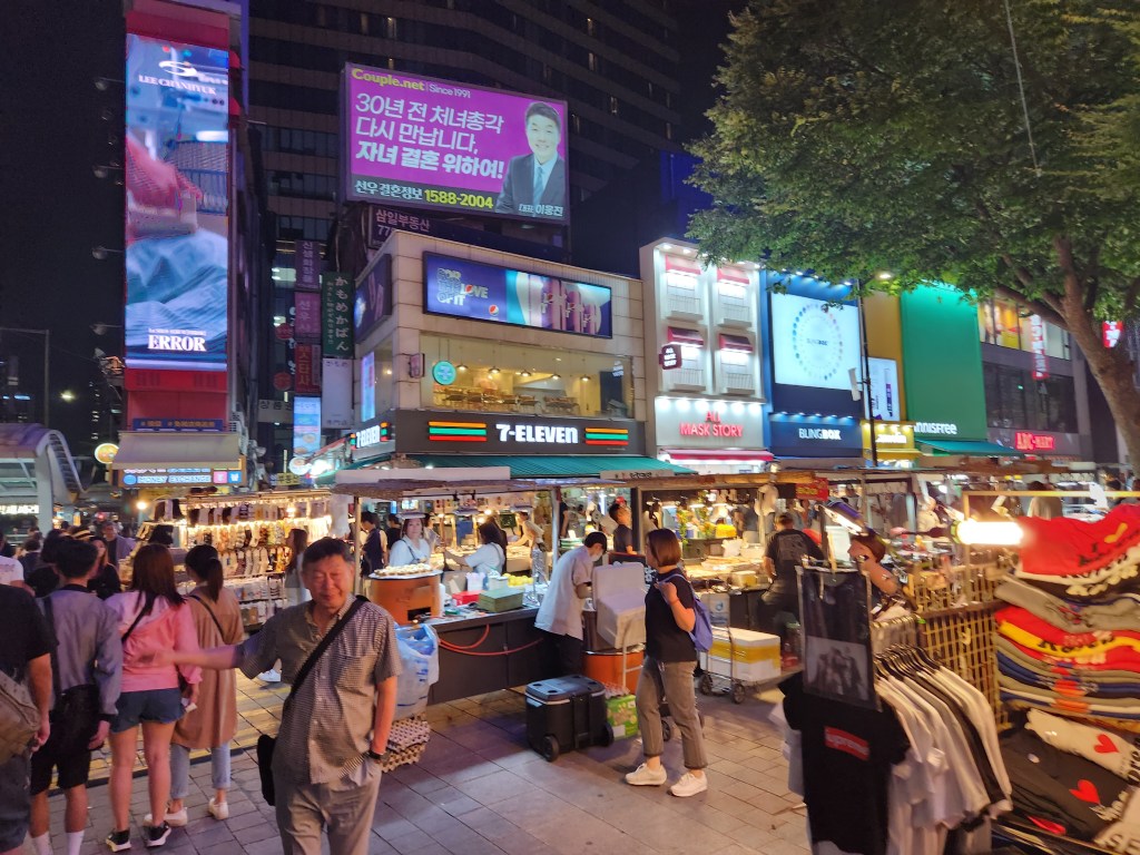 Myeongdong Shopping Street is very popular in Seoul, famous for its beauty and skincare products, and many Korean and International fashion brands. They have underground stores, shopping malls, and a LOTTE Department Store. At night, it turns into a street market with food vendors that line the street. The night market is open from around 4 p.m. to 10 p.m. seven days a week but there are less stalls from Monday to Thursday. It does get a lot more crowded from Friday through Sunday.