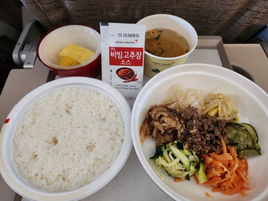Another one of my favorite dishes. We took a bibimbap cooking class but I wasn’t able to take pictures since we were cooking. Here is the bibimbap we had on our Asiana Airlines flight. You mix everything together with the rice and add gochujang sauce. A little sauce goes a long way. If you don’t like spicy, don’t add too much sauce!