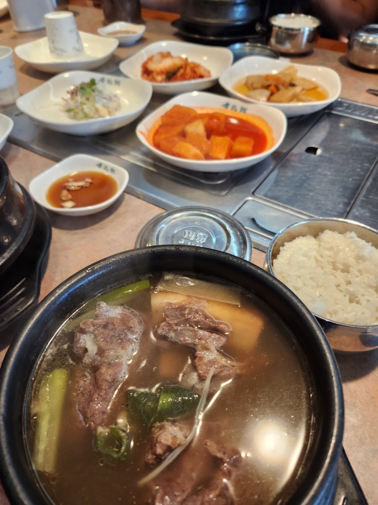 Beef Short Rib Soup includes radish and onions, along with other ingredients. It was our first meal in South Korea and it hit the spot!