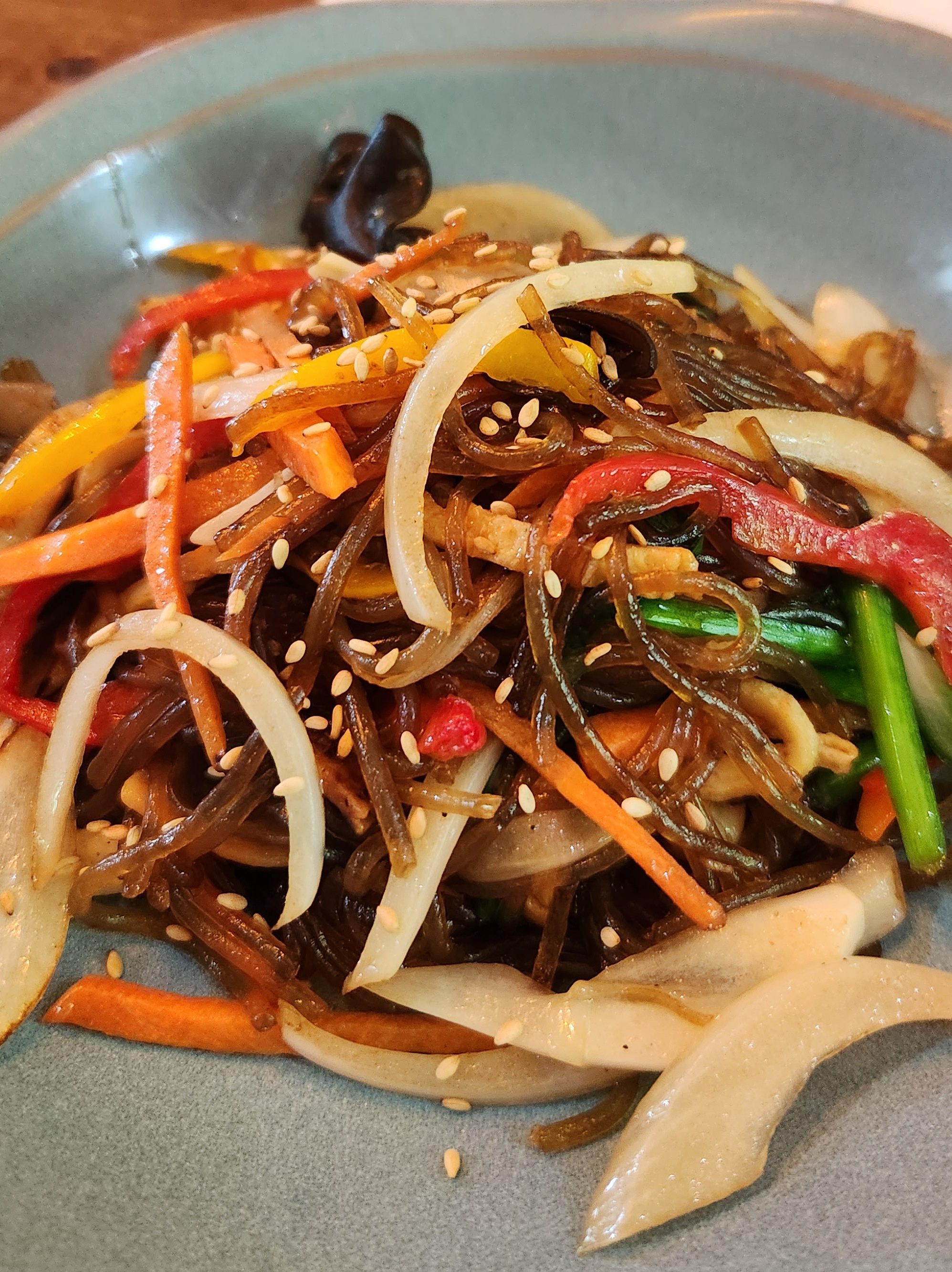Japchae is another popular Korean dish made with sweet potato starch noodles and vegetables.