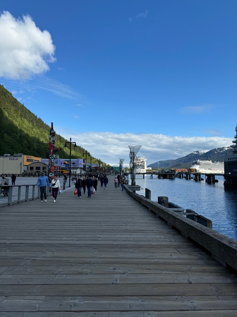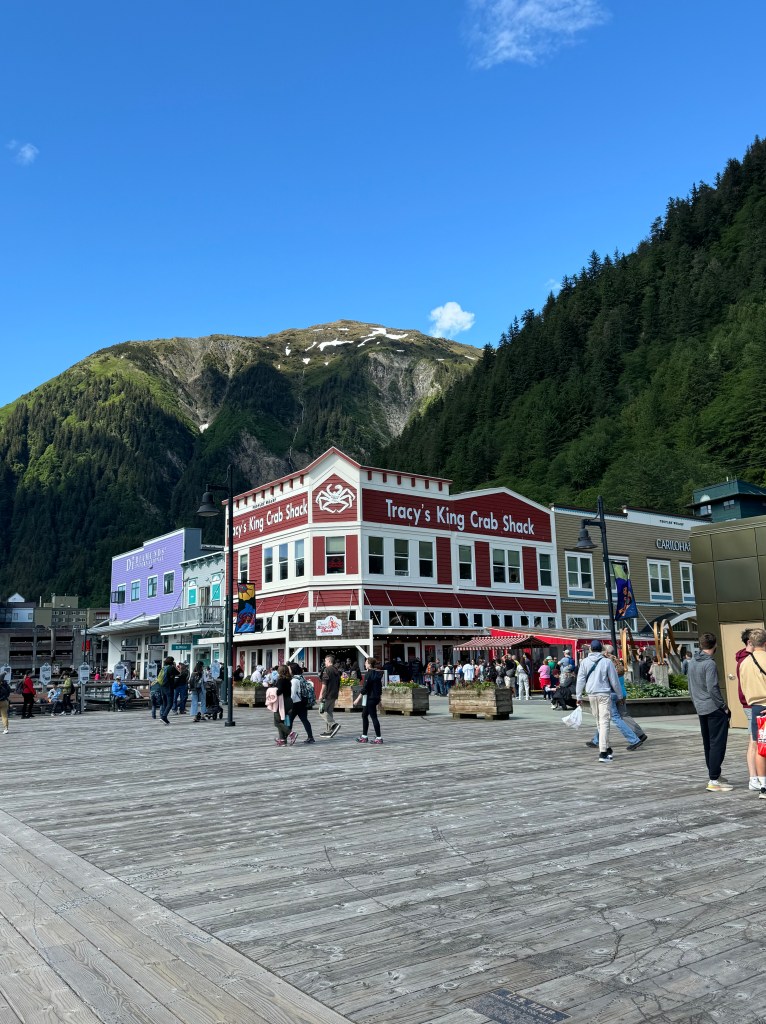 Juneau is a scenic coastal town and the capital of Alaska. Here you will find a street lined with jewelry stores and the famous Tracy’s King Crab Shack. There is usually a long line, especially when the ship first ports, but it does move quickly. If you do not want to wait in line, you can explore the city first, like we did. When we were ready to eat, the line was very short.