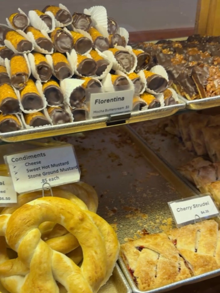 The Danish Bakery serves traditional pastries, soft pretzels, and coffee.