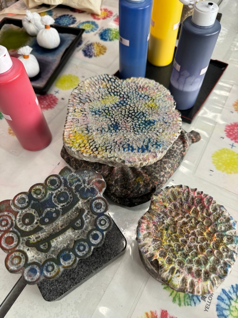 Decorate a tote bag using dye and coral fossils at Shuri Ryusen.